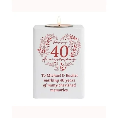 Featuring a "40th Anniversary" design, this wooden Tea Light holder can be personalised with a special message, over 4 lines of 20 characters per line.