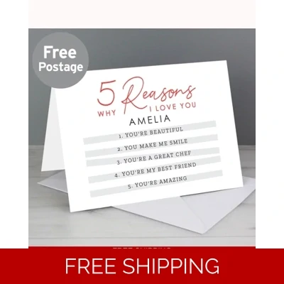 The text "5 Reasons why I love you" to the front is a fixed part of the design. Personalise with your 5 reasons to the front plus your own special message to the inside.