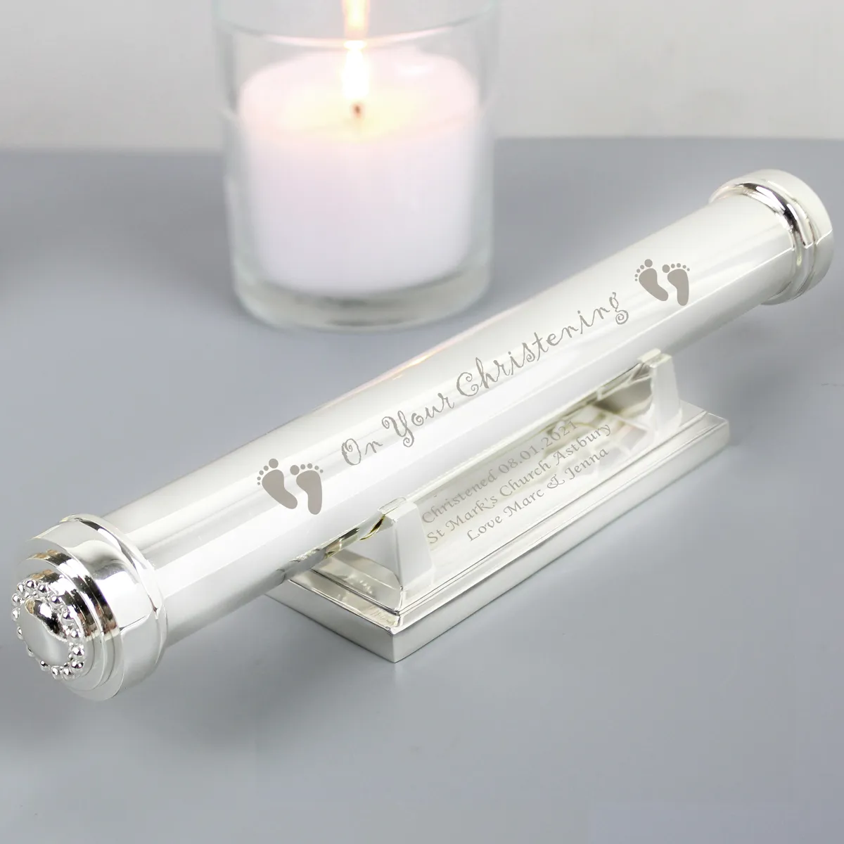 This silver plated certificate holder features a cute footprints motif design.Personalised the stand with any message over 4 lines and up to 25 characters per line. The wording 'On Your Christening' featured on the holder is standard text.
