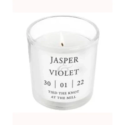 This candle can be personalised with 2 names of up to 15 characters each, 3 Date sections of up to 2 characters each, followed by 2 lines of text, up to 25 characters per line. All personalisation will be in fixed upper text. The '&' is fixed text and cannot be changed.