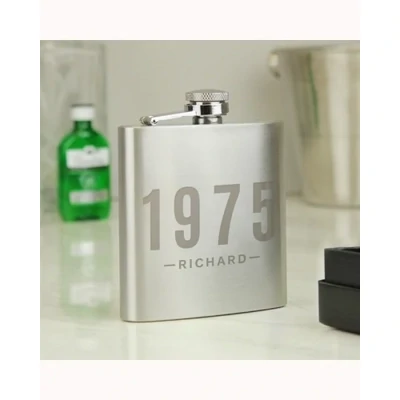 This 6oz stainless steel hip flask can be engraved with a year up to 4 characters and a name up to 12 characters.