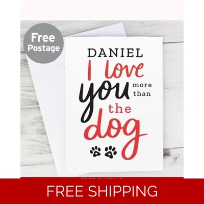This sweet personalised card is perfect for Valentine's Day and features the text "I love you more than the dog" and is perfect for a partner who know how much you love your pampered pooch.