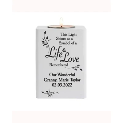 This white wooden tea light holder is a beautiful way to remember the life of a lost loved one.