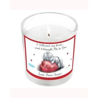 Personalise this Me To You Heart Scented Jar Candle with a name up to 12 characters (which will appear inside of the heart) and a message over 1 line of 25 characters. The words 'I followed my heart... ...and it brought me to you' are fixed.