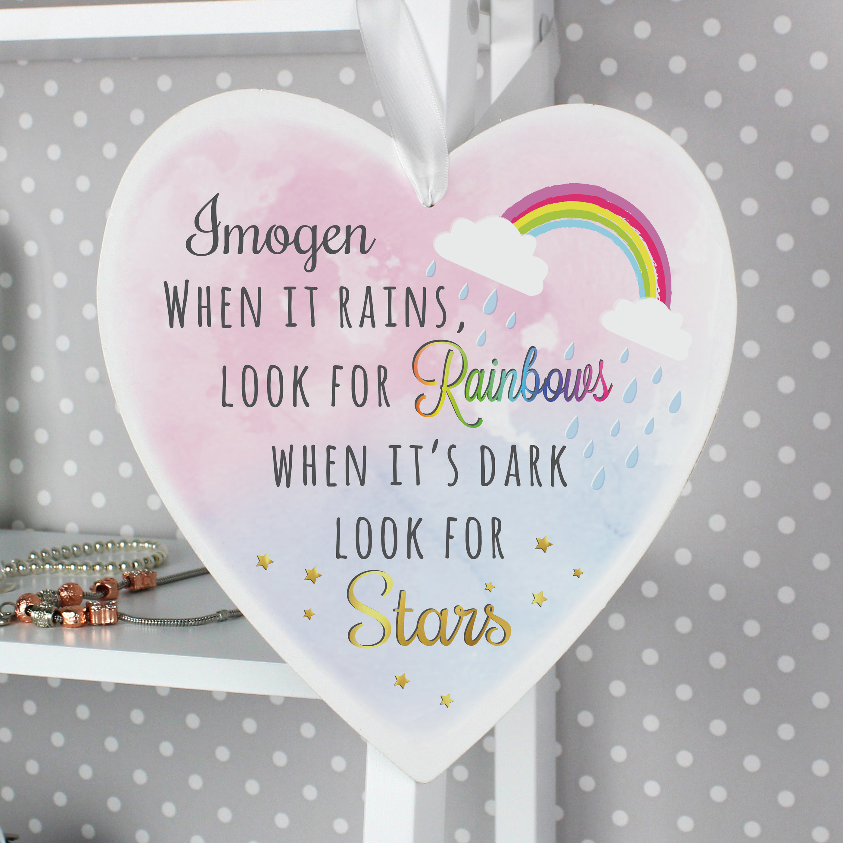 This Personalised Rainbows and Stars 22cm Large Wooden Heart Decoration is an ideal way to brighten any home!