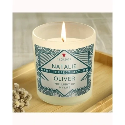 You can personalise this jar candle with a date up to 10 characters long, two names up to 12 characters each and 2 message lines up to 25 characters per line. The names will appear either side of "THE PERFECT MATCH" which is fixed text.