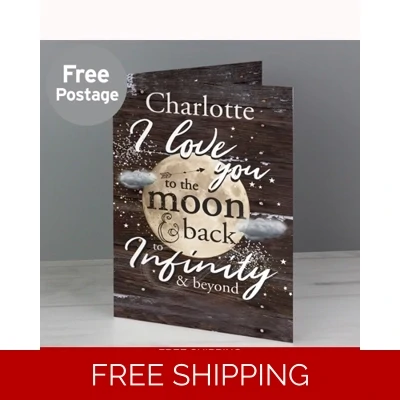 You can personalise the front of this card with a name at the top up to 12 characters. The words 'I love you to the moon & back to infinity & beyond' are fixed.