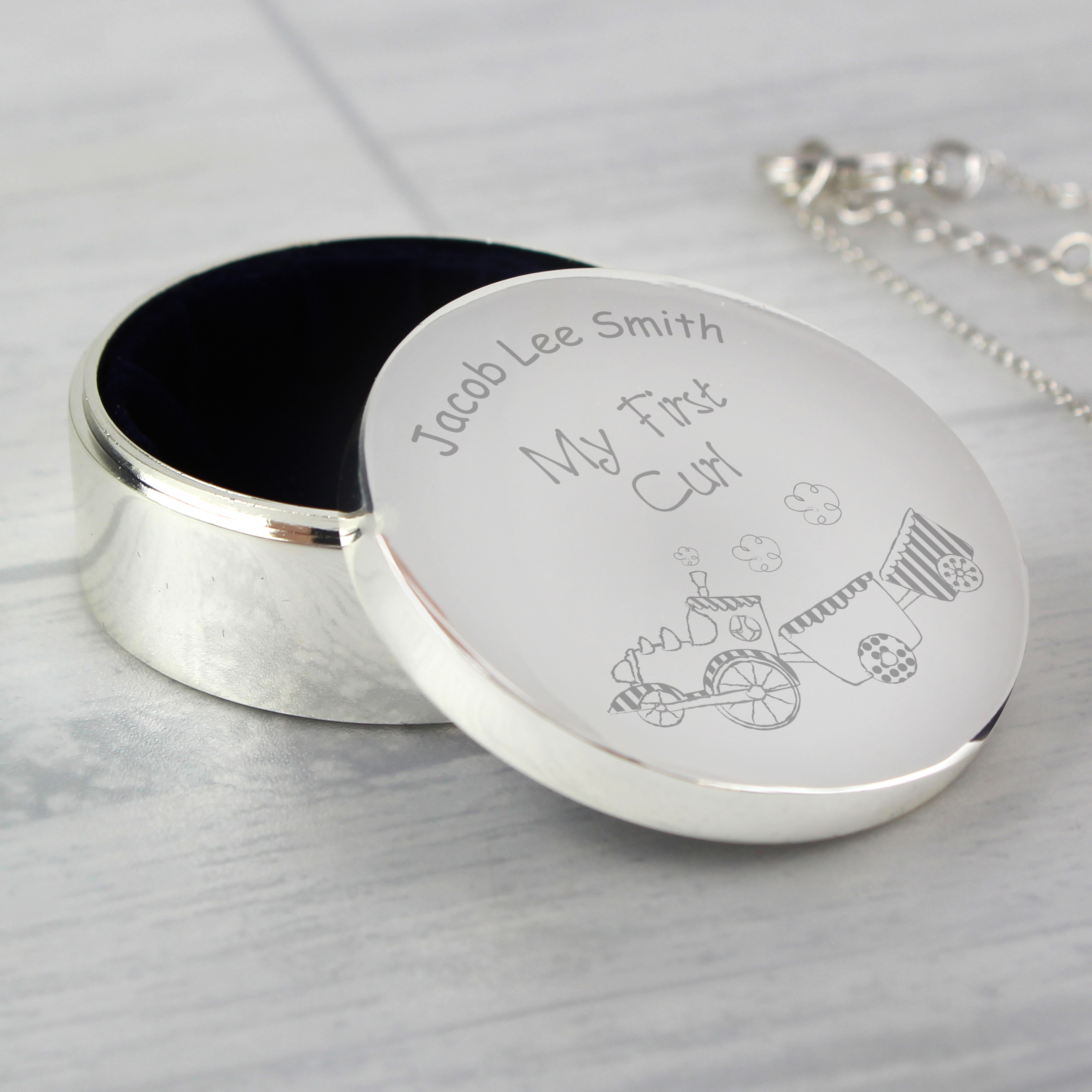 You can personalise the lid of the trinket with any message of your choice up to 20 characters, but a first name and date would suit this product the best. The wording 'My First Curl' is standard text.