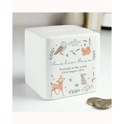 This Personalised Woodland Animals Square Money Box makes the perfect keepsake for that special occasion.